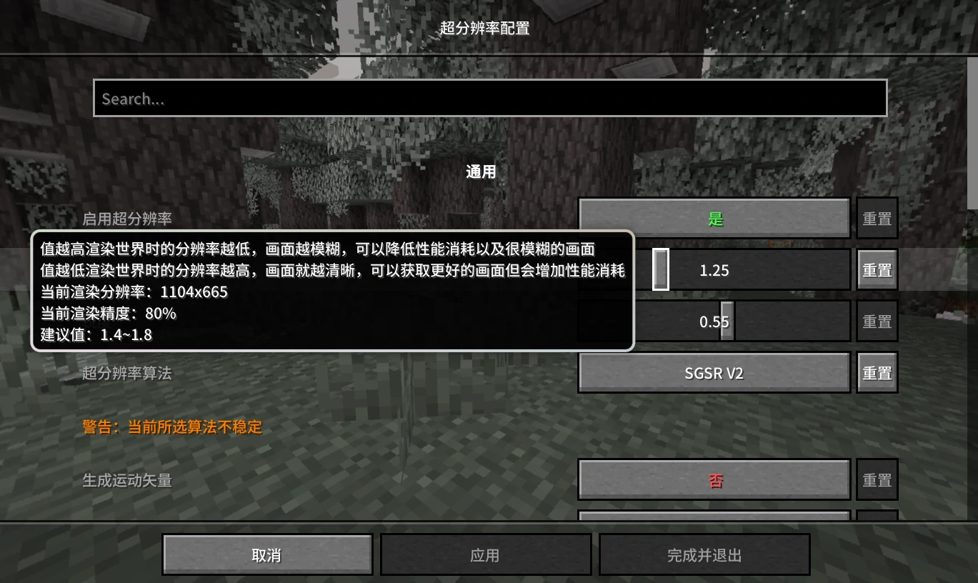 如果您发现画面出现严重锯齿或卡顿,请尝试在ESC菜单->视频选项->Super Resolution中调整超分辨率倍率,将鼠标放在其上会显示帮助信息悬浮窗。